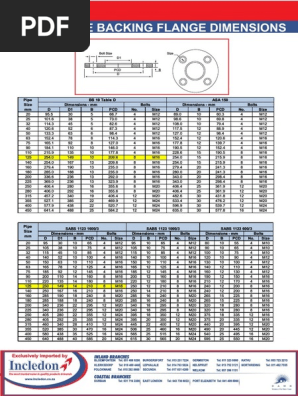 Acu-Tech sells a range of standard size backing rings or backing flanges from 20 mm to 1000 mm diameter. Supply Flange Dimension DN15 - DN2000 12 - 80 Forged Flange. Size 20 955 30 5 667 4 M12 890 10 603 4 M12 25 1016 38 5 730 4 M12 986 10 698 4 M12 32 1143 45 5 826 4 M12 1080 10 794 4 M12 40 1206 52 6 873 4 M12 1175 12 889 4 M12 50 1333 63 6 984 4 M12 1270 12 984 4 M12.